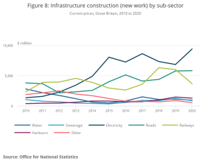 The ONS construction data also showed that the highest construction growth was in infrastructure. In 2022 infrastructure-focused construction grew by 29.5% compared to February 2020, and achieved a combined value of £2.4BN.